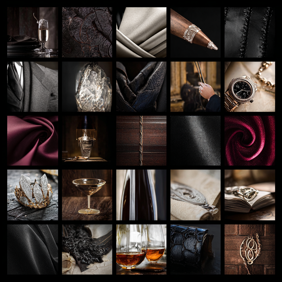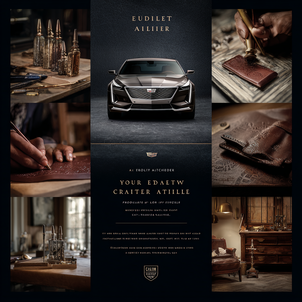 Heritage Mood Board Prompt: "Create a sophisticated mood board that bridges Cadillac's American luxury heritage with electric innovation. Visual elements should include: Color Palette: Deep midnight blue, warm brass/copper accents, crisp white, charcoal graphite, with electric blue highlights representing energy and innovation. Heritage Elements: Vintage Cadillac design cues (art deco grilles, tailfins, chrome details), classic American industrial photography (Detroit factories, steel mills), handcrafted luxury materials (leather, wood grain, polished metal), historical American innovation imagery..."